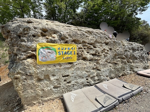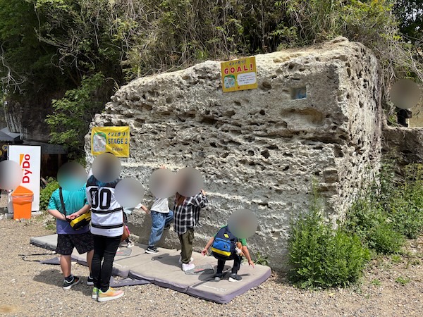 柔らかく手ざわりの良い大谷石の壁を使ったクライミング体験。