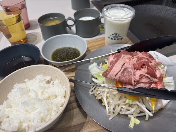 テーブルの中央には鉄板が設置されており、焼き肉スタイルで楽しめるのが大きな魅力!