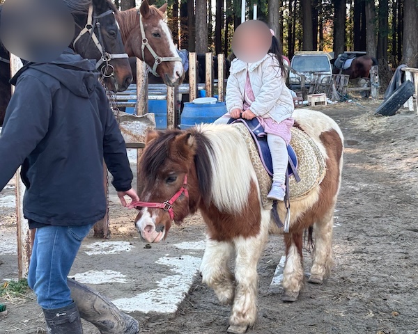 最初は大きな馬に「ちょっと怖い…」という様子だったものの、ポニーを見た瞬間に表情がぱっと明るくなり、「この子に乗るー!」と自信満々に。