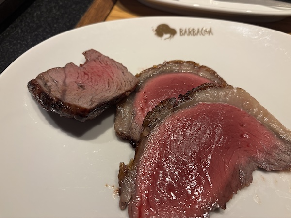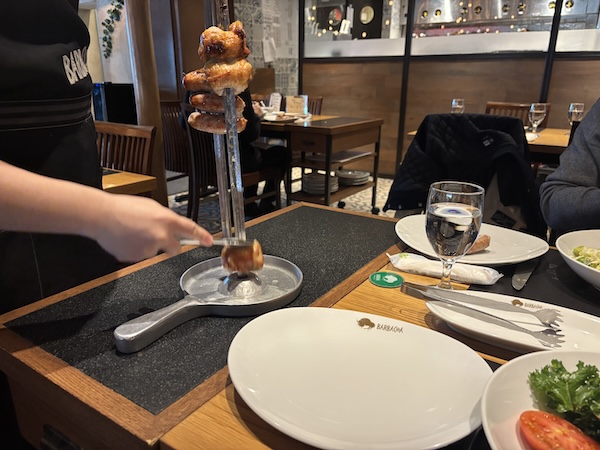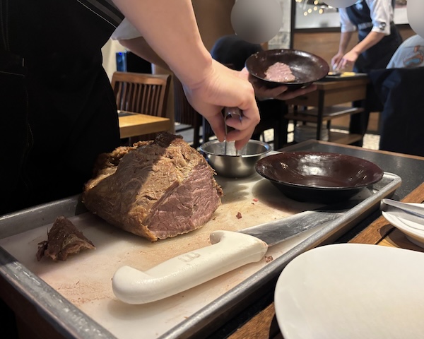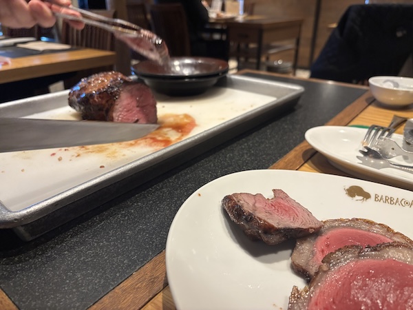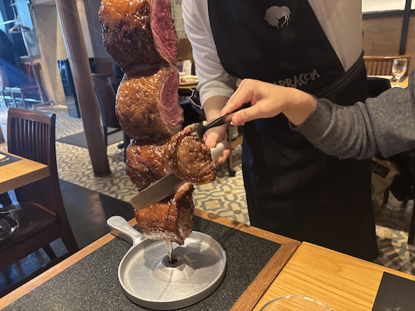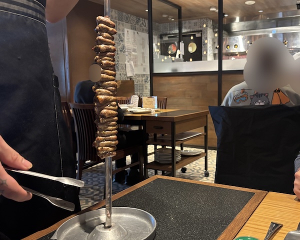 シュラスコは、スタッフさんが大きな塊肉を持ってテーブルを回り、焼き上がった一番美味しいタイミングで切り分けてくれます。